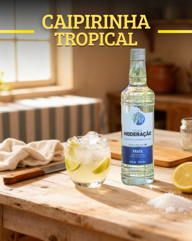 Com sabor suave e cristalino, a Moderação Prata é perfeita para quem busca versatilidade: vai bem pura, realça sabores em drinks e transforma qualquer caipirinha em uma experiência ainda mais refrescante. Na imagem, ao lado do copo com limão e gelo, ela reforça exatamente sua proposta — leveza, frescor e autenticidade.